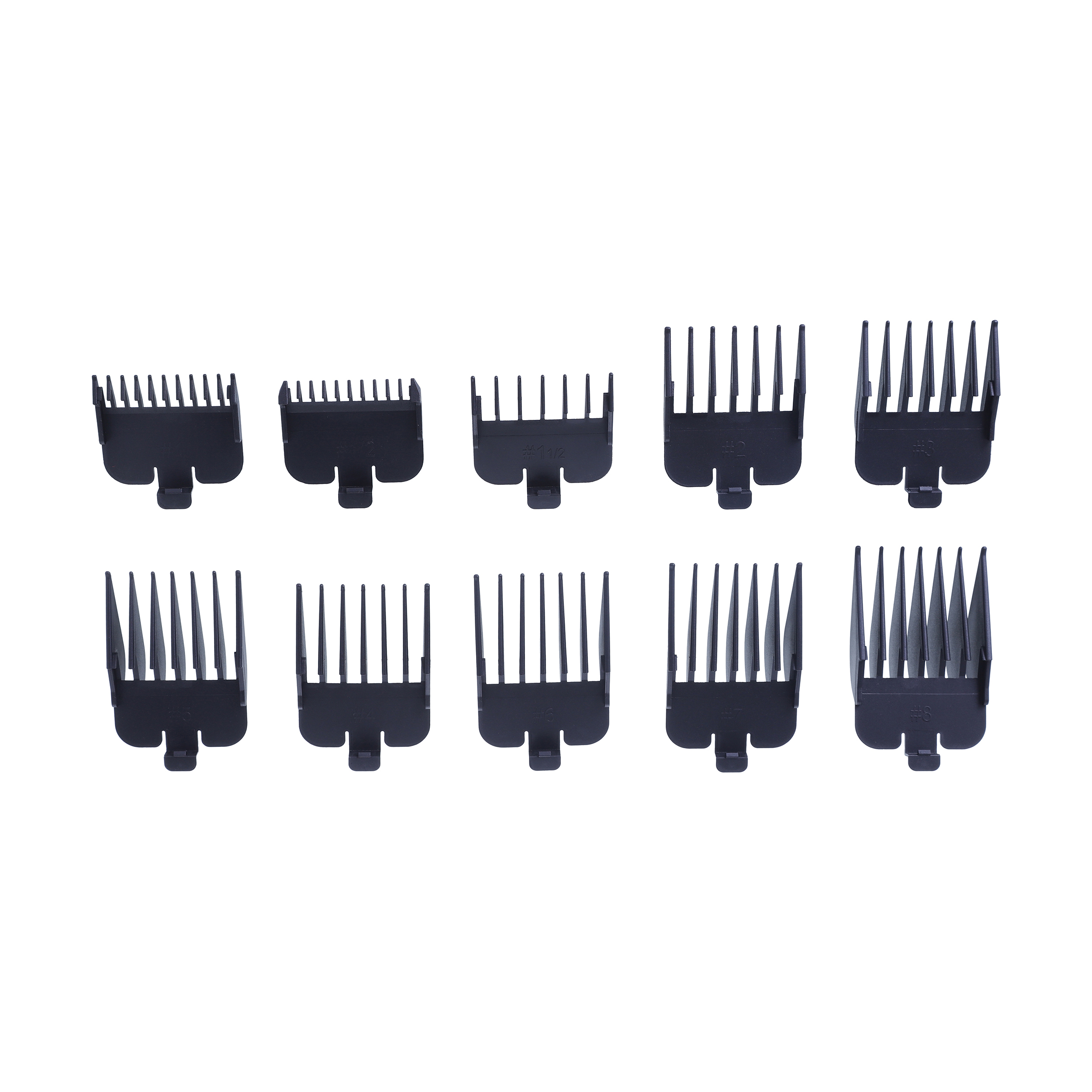 همراه با ده عدد شانه با سایزهای:  1.5 / 3 / 4.5 / 6 / 10 / 13 / 16 / 19 / 22 / 25 میلی‌متر