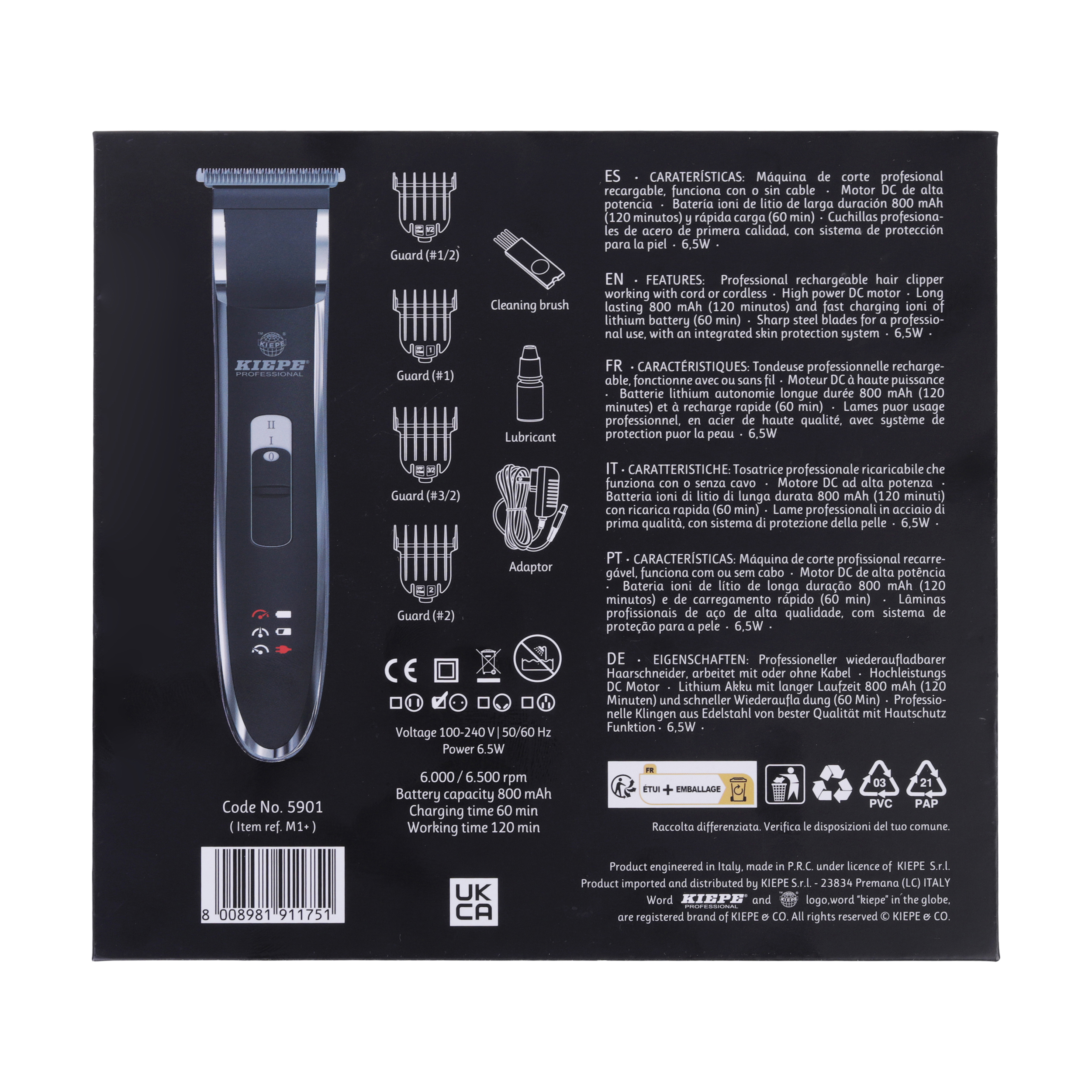 این تریمر قابلیت استفاده با سیم و بدون سیم را دارد و دارای دو سرعت است و با چهار عدد شانه در سایزهای 1.5، 3، 4.5 و 6 میلیمتر می توان به سایز مناسب اصلاح رسید.